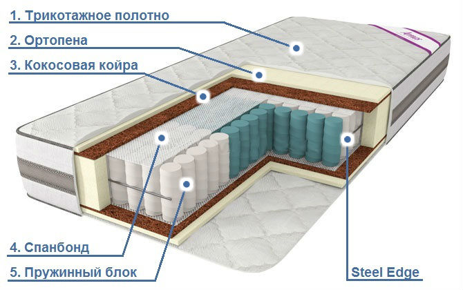 - Спанбонд. Дополнительный слой из нетканого материала находится между блоком пружин и каркасом из кокосового волокна. Отвечает за дополнительный комфорт во время сна.