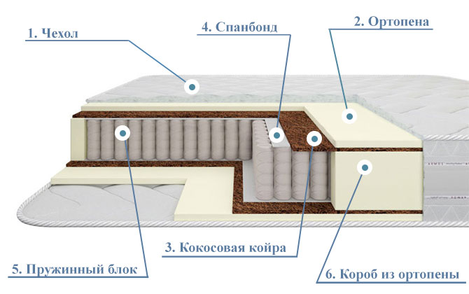 3. Кокосовая койра (1 см). Термосклееные плиты из кокосового волокна не впитывают влагу, хорошо пропускают воздух – это способствует поддержанию здорового микроклимата спального места, и увеличивает срок службы матраса. Чтобы матрас не прогибался, и нагрузка во время отдыха была правильно распределена, кокосовое волокно дополняют латексом. Это увеличивает прочность наполнителя в разы.