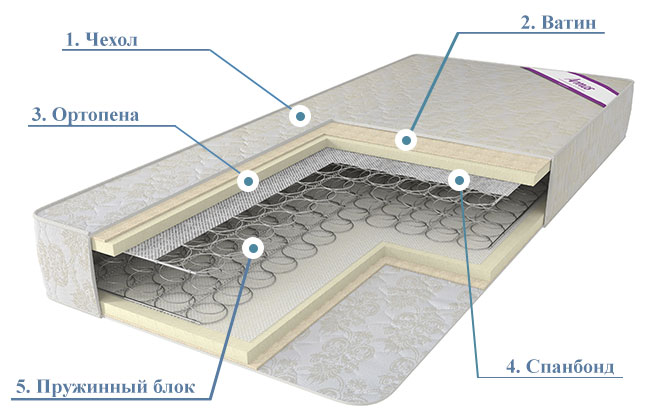 4. Спанбонд. Современный нетканый материал высокой прочности используется как прокладочный слой между пружинным блоком и ортопеной. Из-за своей прочности на разрыв и истирание выдерживает воздействие металлических пружин и сохраняет от деформации слой ортопены.