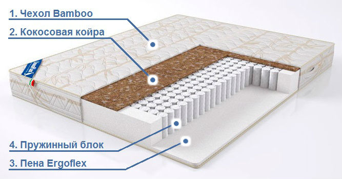 2. Кокосовая койра (1 см). Натуральный наполнитель, пропитанный латексом, уже много лет является основным материалом в конструкции матрасов. Такая популярность объясняется высокой упругостью и прочностью при высоких нагрузках. Кокосовые плиты помогают позвоночнику принять естественное положение, избавляют вас от болей в спине и шее.